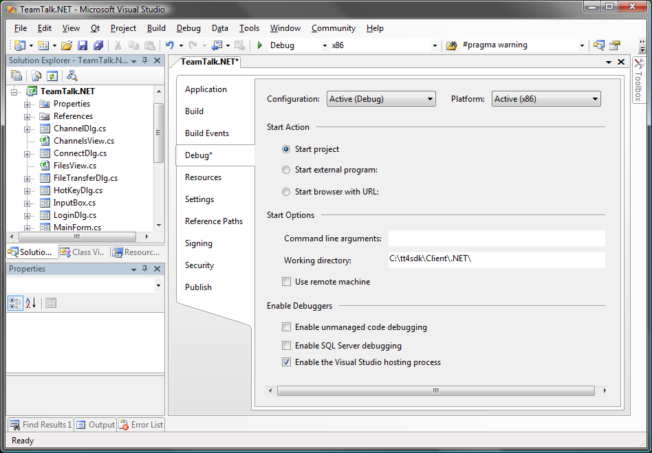 To build the example start Visual Studio 2010 or later and open the file TeamTalk.NET.csproj. Once opened notice the configuration says x86 and not "Any CPU" as it usually does in .NET projects. This is because the .NET DLL is compiled to run on x86. On Windows x64 Visual Studio will automatically build applications for x64 execution. In order to run the example the working directory for the debugger must be set to the Library/TeamTalk_DLL directory of the SDK (where the native TeamTalk5 DLL is located). This is done in the project settings as shown in the picture below: