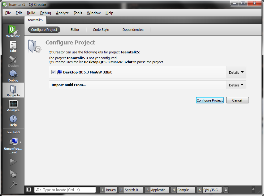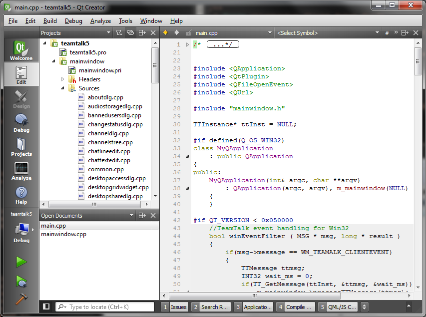 Once installed start Qt Creator and open the project file: Client/qtTeamTalk/teamtalk5.pro or Client/qtTeamTalk/teamtalk5pro.pro for the Professional Edition of the SDK.